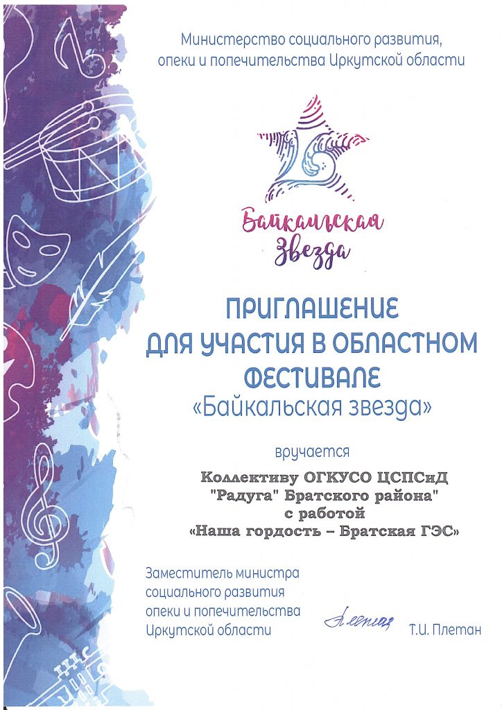 Жюри по достоинству оценило старания и труды коллектива, и заместителем министра социального развития опеки и попечительства Иркутской области Т. И. Плетан нам вручено приглашение на областной Фестиваль «Байкальская звезда», который состоится в г. Иркутск 1 июня 2025 года.
