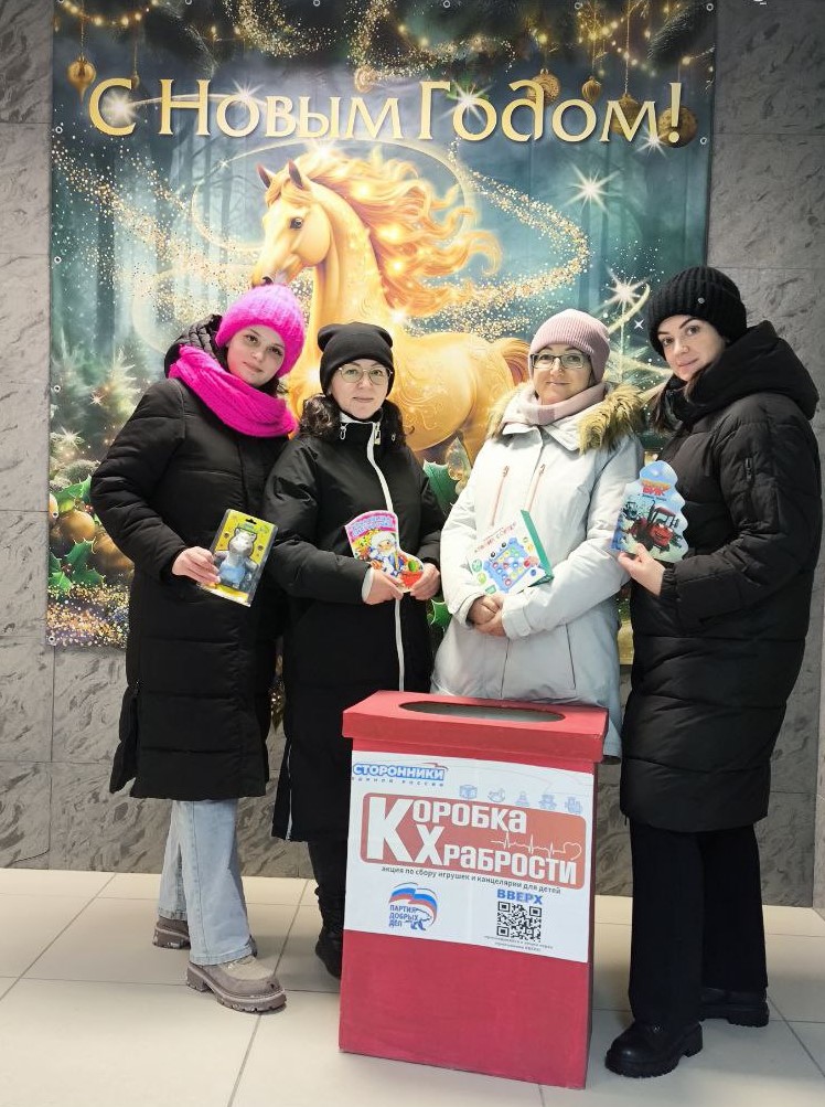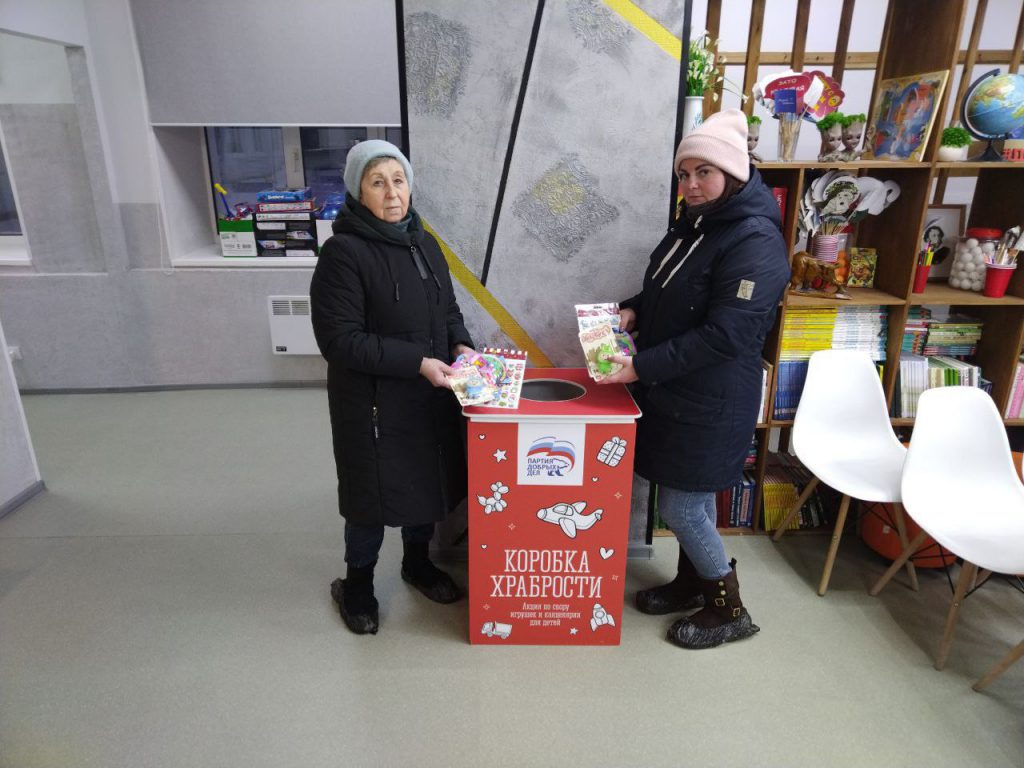 Всероссийская благотворительная акция «Коробка храбрости», запущенная «Единой Россией» заключается в сборе безопасных для малышей игрушек, книжек, раскрасок и других приятных сюрпризов. Игрушки предназначены для детей, проходящих лечение в больницах и хосписах.