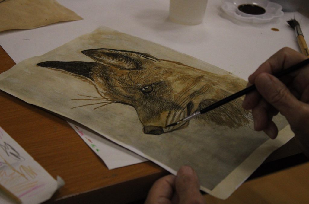 2. Создание базового слоя: нанесение разбавленного кофейного раствора на поверхность бумаги с помощью обыкновенной художественной кистью. Чем насыщенней раствор, тем ярче тон.